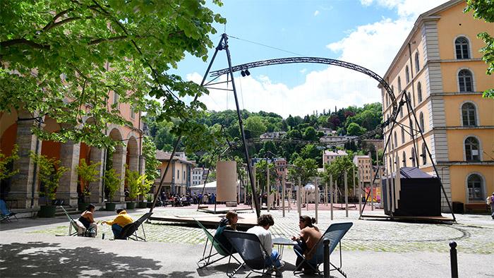 C’est CRESCENDO, une installation aérienne qui investit les espaces extérieurs des Subs jusqu'à l'automne. Jeune circassien et plasticien, Julian Vogel fait de la suspension l’objet de ses investigations artistiques en explorant toutes les potentialités de la céramique. CRESCENDO déploiera dans l’espace une courbe métallique ascendante, entraînant dans son élan plus de 95 cylindres céramiques en lévitation.