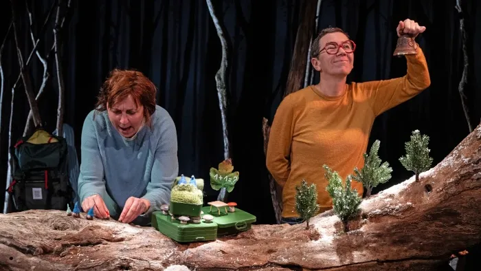 Trois interprètes manipulent de petits êtres à bonnet de laine et prennent leurs mimiques et leur malice. Sur scène, on aperçoit le tronc d’un pommier : le village des lutins. La scénographie de Valentin Périlleux offre son lot d’inattendus et d’émerveillement.